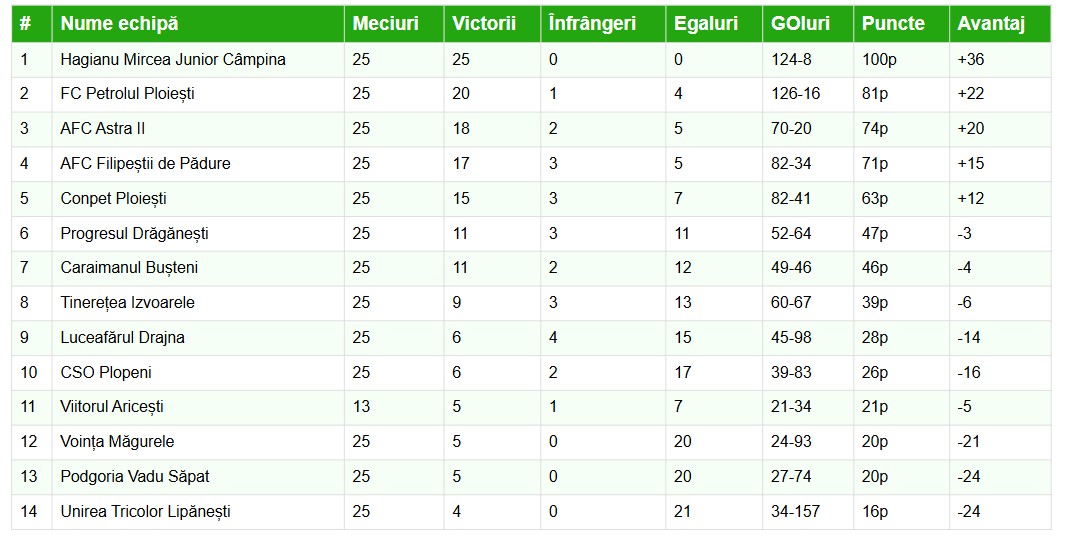 | 4 | AFC Filipeștii de Pădure | 25 | 17 | 3 | 5 | 82-34 | 71p | +15 |