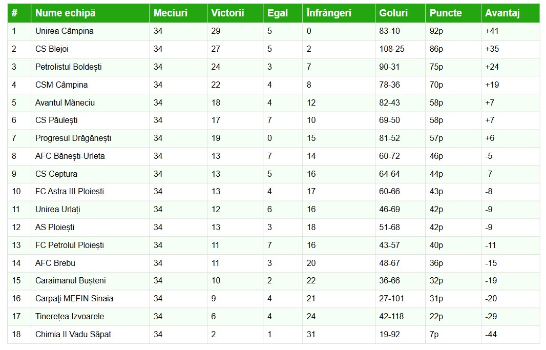 | 2 | CS Blejoi | 34 | 27 | 5 | 2 | 108-25 | 86p | +35 |