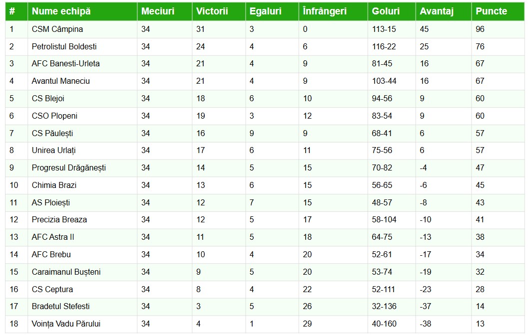 | 1 | CSM Câmpina | 34 | 31 | 3 | 0 | 113-15 | 45 | 96 |