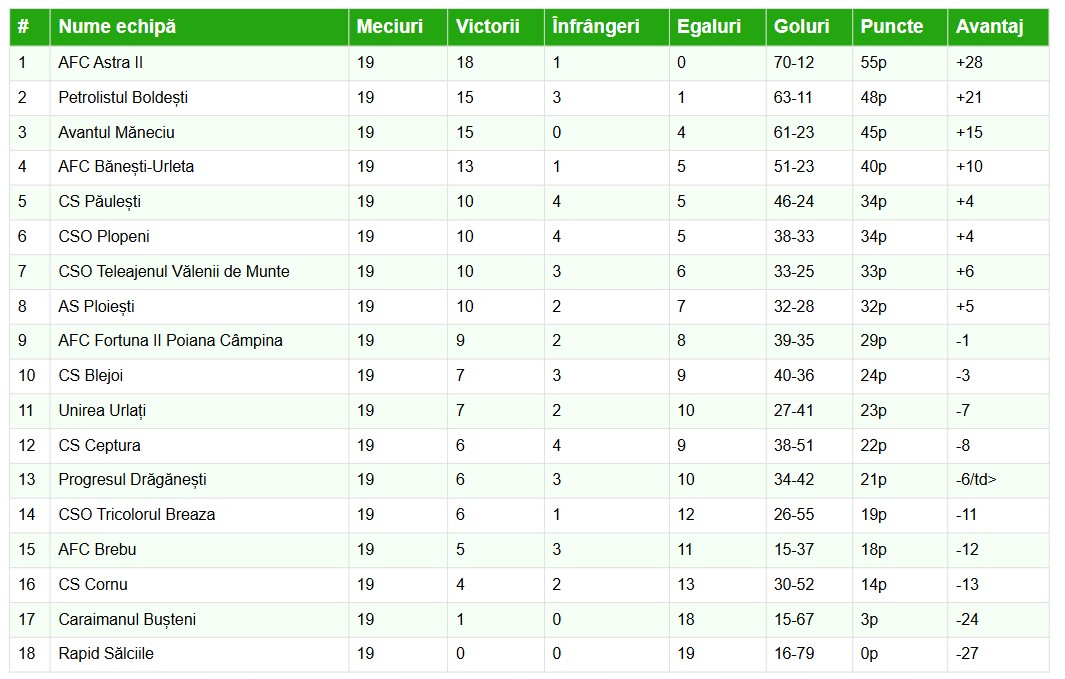 | 9 | AFC Fortuna II Poiana Câmpina | 19 | 9 | 2 | 8 | 39-35 | 29p | -1 |